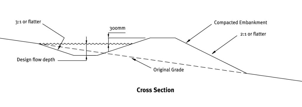 - In some examples (eg steep slopes and/or unstable ground), specific geotechnical design will be required to make sure that the diversion works.