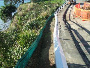 Silt fence installed across a loess hill slope in the Port Hills.