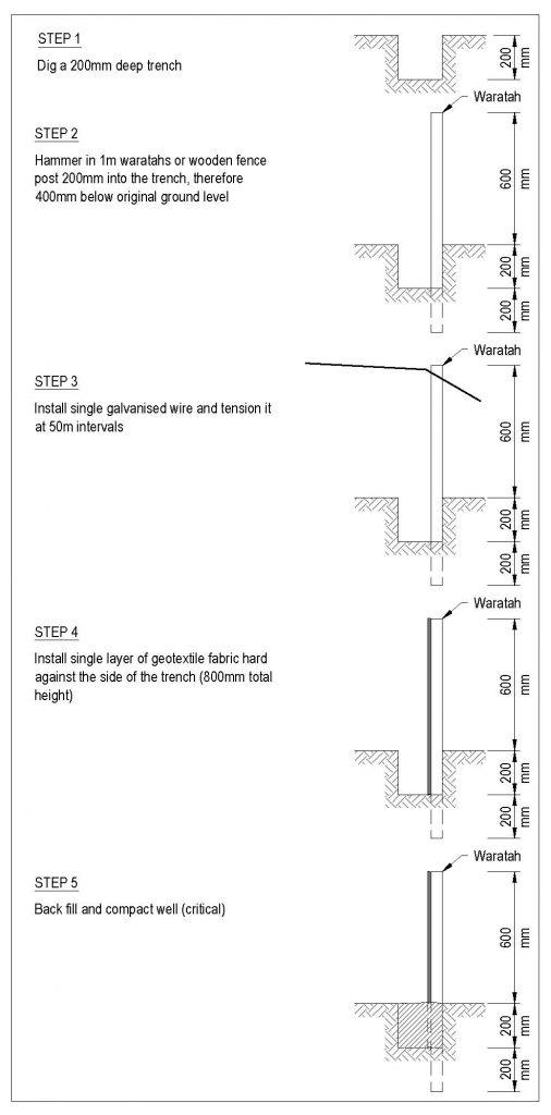 - Excavate a trench at least 100 mm wide and 200 mm deep along the proposed line of the silt fence.